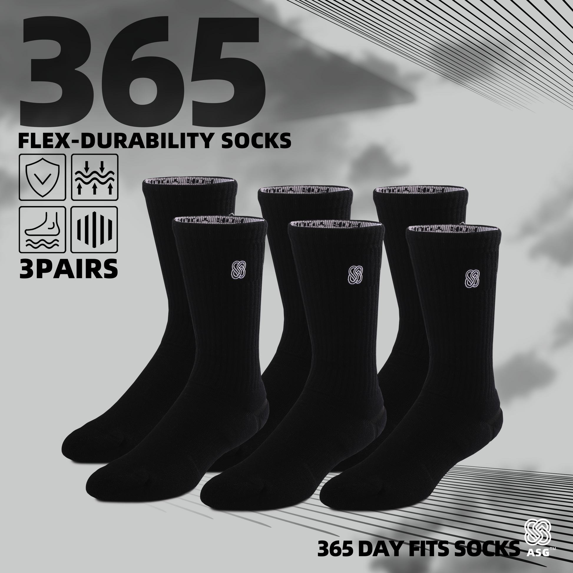 ASG 365 day fits socks:Designed with elite, pro-grade materials and made from premium elastic and breathable knit, ideal for daily wear and light sports. These socks offer a comfortable fit with V-shaped heel stabilization; they are 23.5% heavier than standard sports socks, providing enhanced durability and support for everyday use.